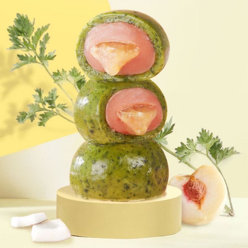 酸甜山楂包裹白桃果酱,, ,,, ,,,入口条理富厚,, ,,, ,,,软滑的糯皮带着淡淡艾草的清香,, ,,, ,,,酸甜山楂与香甜果酱在口中交织迸发,, ,,, ,,,春天的味道跃然于舌尖。。。。。。